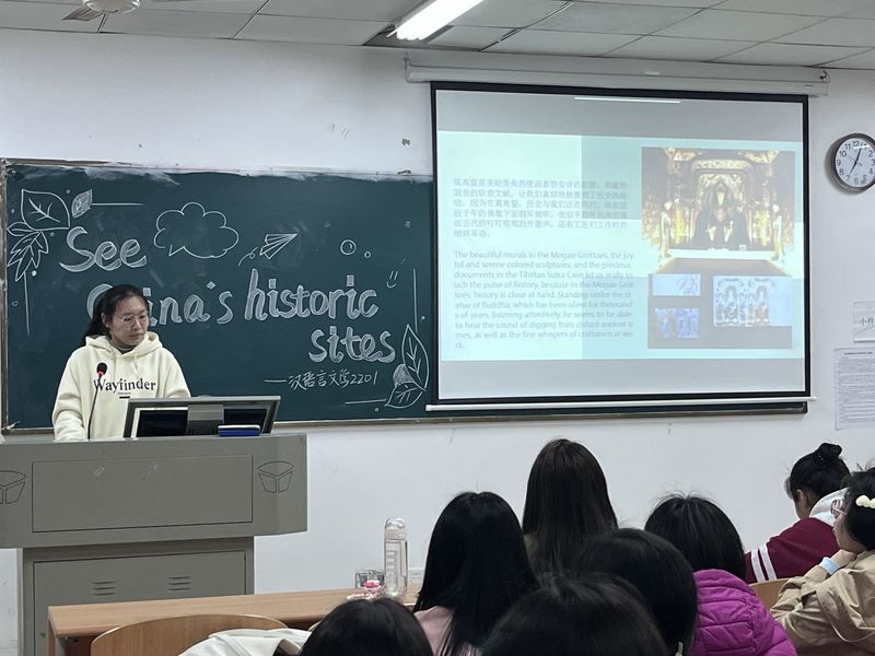 为了提高人文学部学生学习英语兴趣,引导他们积极主动学习英语,人文学部开展了英语角活动。此活动分为英语专业和非英语专业两个类别。英语专业共组织了两期活动,第一期活动主题为Favorite songs(最喜欢的歌曲),第二期活动主题为Tell Chinese stories(讲中国故事),活动形式为各班选手依次展示,每人分享一首歌,带领大家欣赏歌曲,了解歌曲背后的故事。非英语专业班级主题为See China’s historic sites(看中国名胜古迹),各班展示时采取一人独讲或两人合作的方式,带领大家欣赏中国不同的名胜古迹