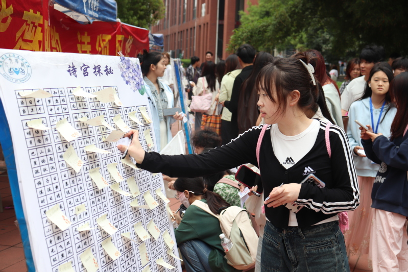 本次文化节以紫薇花为媒,通过班级群预热宣传、古风展牌场景营造,构建沉浸式诗词空间,共发放150余份纪念品。活动精心设计“词海拾贝”“墨客追踪”“诗贴探秘”“飞花令”四大互动关卡,将诗词填空、诗人匹配、背景解读、限时吟诵等内容融入趣味挑战。参与者手持积分卡穿梭其中,在古典韵律与现代创意的交融中,不仅展现文学功底,更深刻感悟千年文脉的精神内核。成功集齐四枚印章的师生,可兑换定制文创纪念品与活动证明,让文化体验更具仪式感。