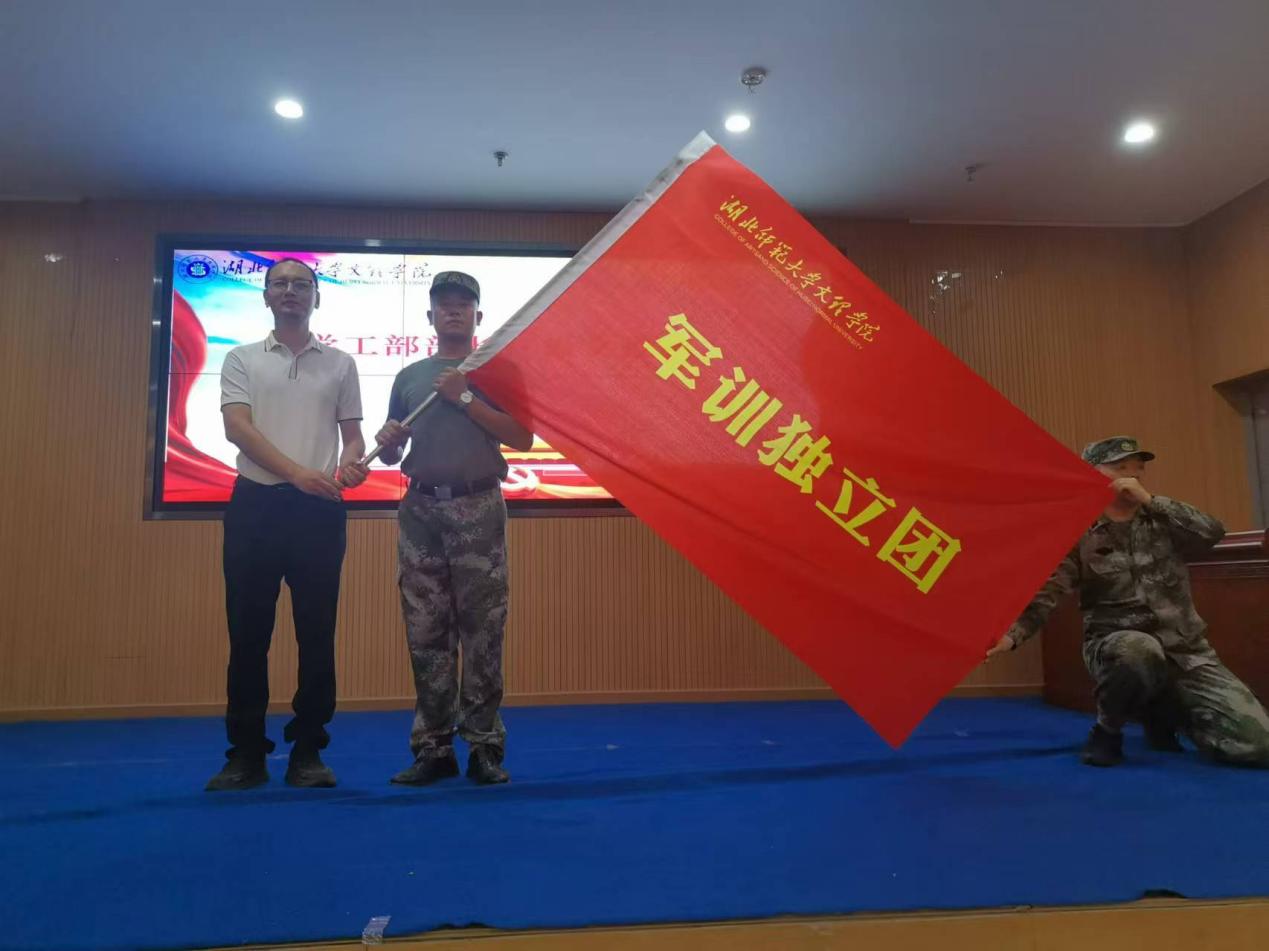 学工部部长汪崇文将代表着责任与荣誉的旗帜郑重地授予承训教官,象征着军训之旅的正式开启。