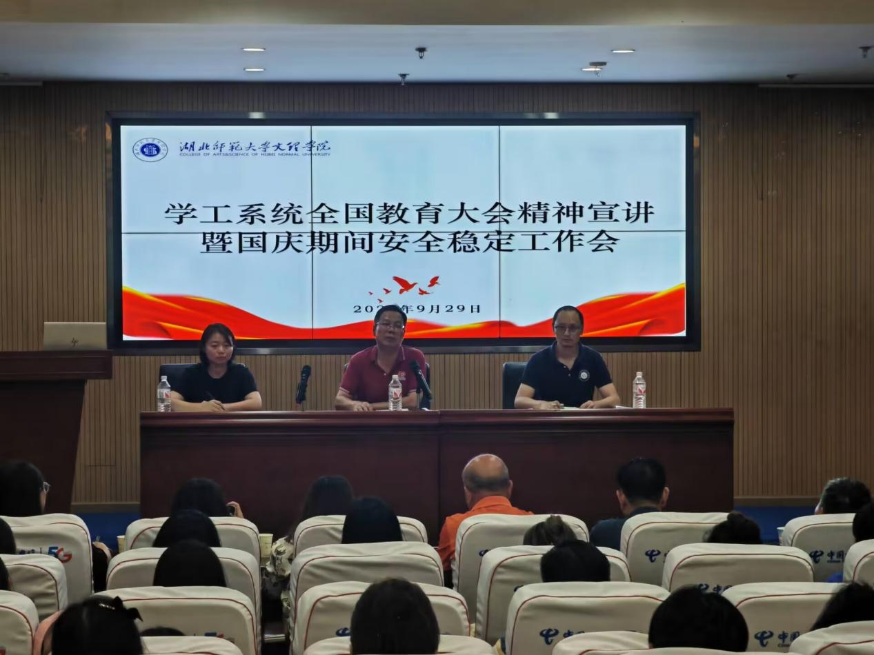 9月29日下午两点半,米乐官方网页版_米乐(中国)在图书馆报告厅召开全国教育大会精神宣讲暨国庆期间安全稳定工作会议。校党委副书记杨之毛、学工部部长汪崇文、心理中心主任陈庆、各教学单位分管学生工作书记(副书记)以及全体辅导员老师参加。会议由学工部部长汪崇文主持。