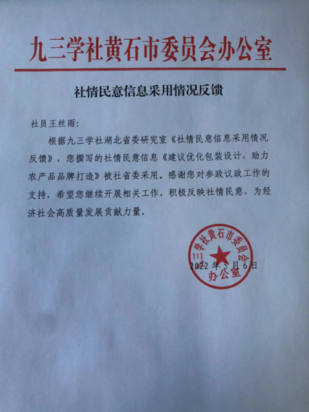 近日,据九三学社黄石市委员会反馈,米乐官方网页版_米乐(中国)教育与艺术学部专任教师王丝雨撰写的社情民意信息《建议优化包装设计,助力农产品品牌打造》被九三学社湖北省委采用。