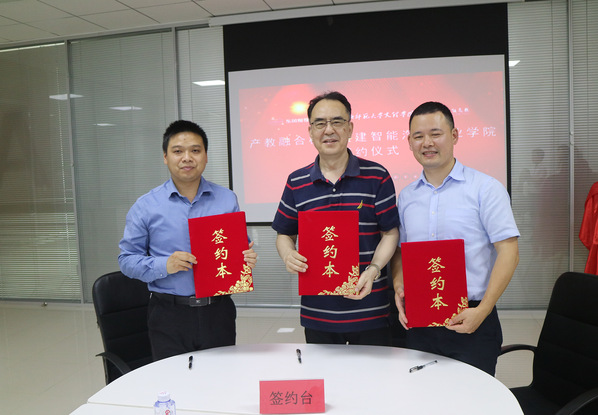 我校李咏成董事长、优能高教高国虎董事长、东风悦享首席技术官曹恺博士共同签署了《共建“优能东风悦享新能源汽车产业学院”合作合同》