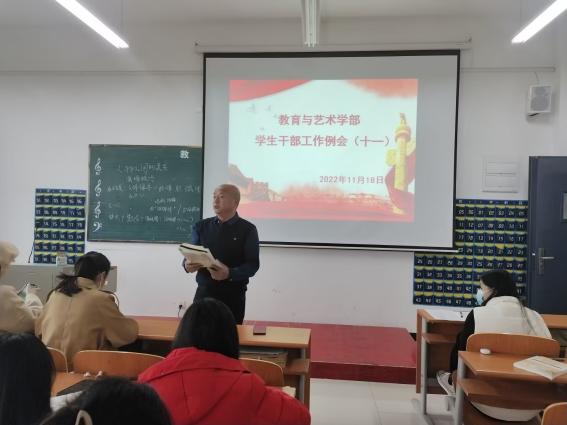 20221118日中午1200,在实验楼1-403多媒体教室组织召开学生干部工作例会。学部辅导员、全体团学会干部及各专业班级负责人到会,例会由总支书记李先华主持。