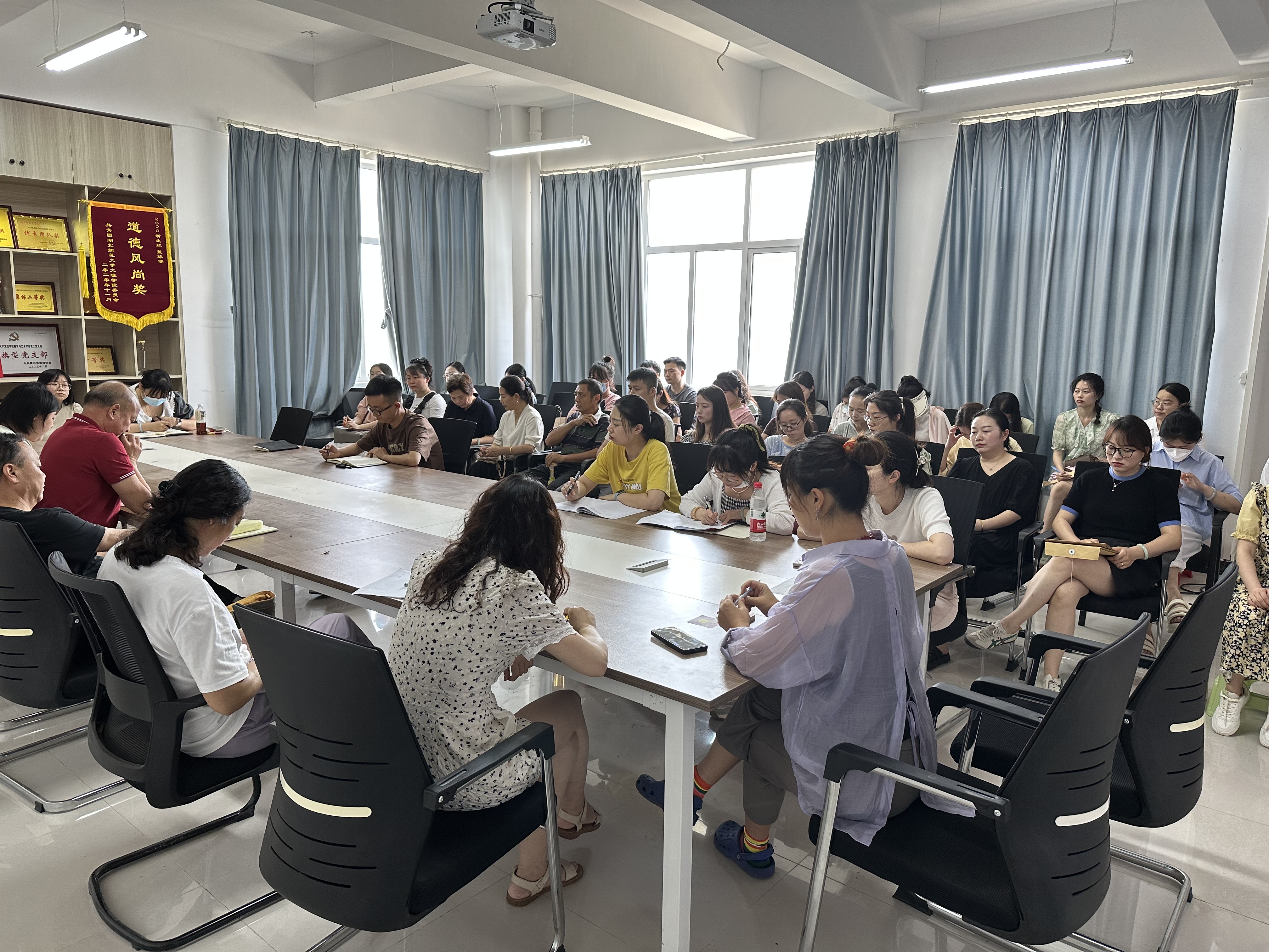 2023年6月14日中午12:00,教育与艺术学部在1号实验楼414会议室召开了学部全体教职工期末工作会议。会议有三项议程:1.胡蕾老师领学中共中央相关文件精神;2.李先华书记重点强调学部在就业、学生安全、期末考试、毕业生相关等方面的工作;3.王文主任做最后总结,并对期末重点工作进行安排部署。