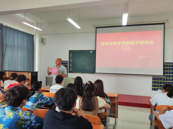 2023年9月15日(星期五)中午12:00,在实验楼1-403多媒体教室组织召开学生干部工作例会。全体辅导员、团学会干部及各专业班级负责人参加。例会由学部总支书记主持。具体工作如下: