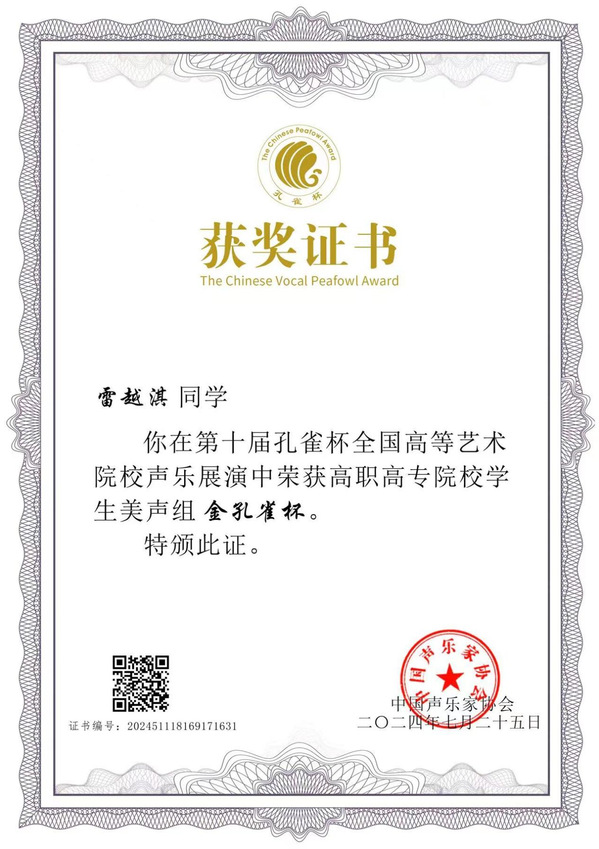 7月18日至7月25日第十届孔雀杯全国高等艺术院校声乐展演暨第八届高校声乐学术交流活动在华南师范大学音乐学院举行。米乐官方网页版_米乐(中国)教育与艺术学部23级音乐教育2302班的雷越琪同学(指导教师高月霞)以决赛第一名的成绩获得高职高专组金孔雀。这是米乐官方网页版_米乐(中国)学子在国家级声乐比赛中获得的又一次突破。在展演活动中雷越淇同学还被选中青歌赛金奖获得者王莉教授声乐大师班,受到王莉教授高度评价。