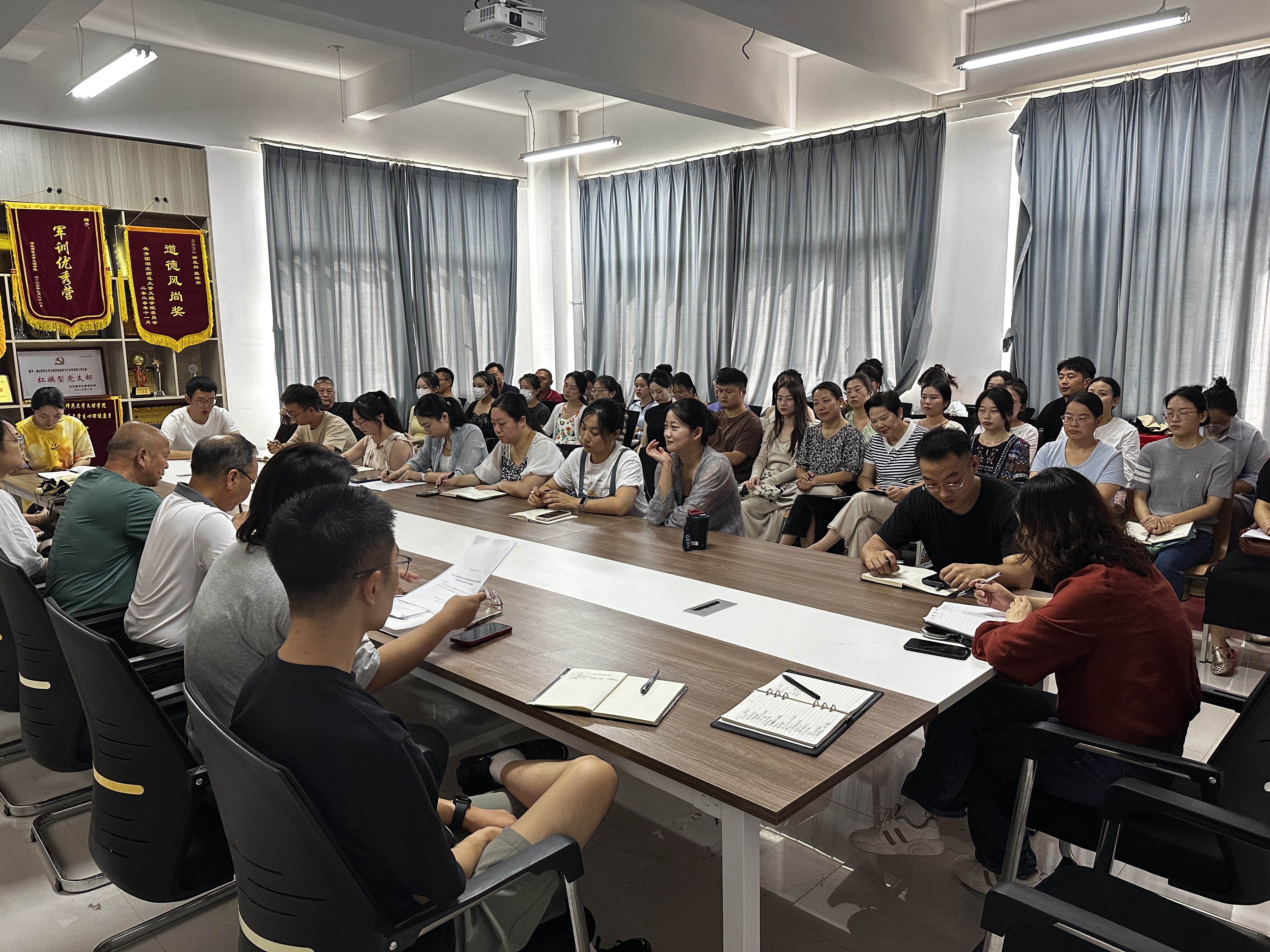 2024年8月30日上午9:00,教育与艺术学部在1号实验楼414会议室召开了全体教职工新学期工作会议,本次会议主要包括以下几个议程:1.新进教职工自我介绍;2.胡蕾老师领学了学校关于师德师风的两份文件;3.李先华书记传达了29日校秋季开学工作会的会议精神;4.王文主任根据师德师风两份文件要求老师们要做到爱岗敬业、遵纪守法,随后强调了新学期的重点工作:确保第一周课堂教学的顺利进行;提前部署就业工作;做好毕业论文的过程管理;安排好开学学生报到注册工作事宜;做好青年教师讲课比赛的准备工作;5.各教研室开展教研活动,为新学期的工作做好准备。