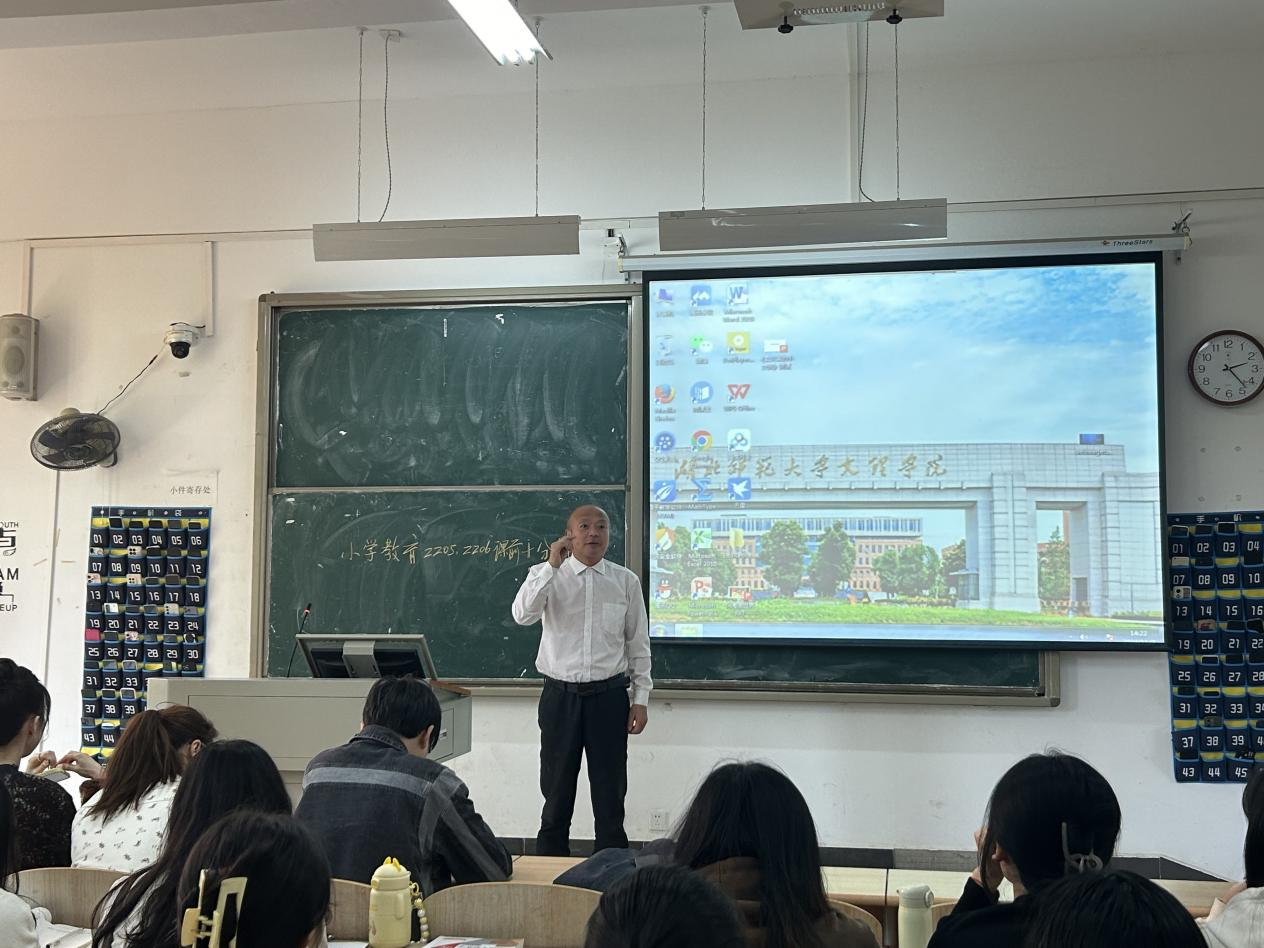 为加强学风建设,提高同学们的专业技能,2024年11月7日14:00,党总支书记李先华带领全体辅导员前往教学楼1B207检查小学教育2205班和2206班的课堂,查看“课前十分钟”说课的建设情况。