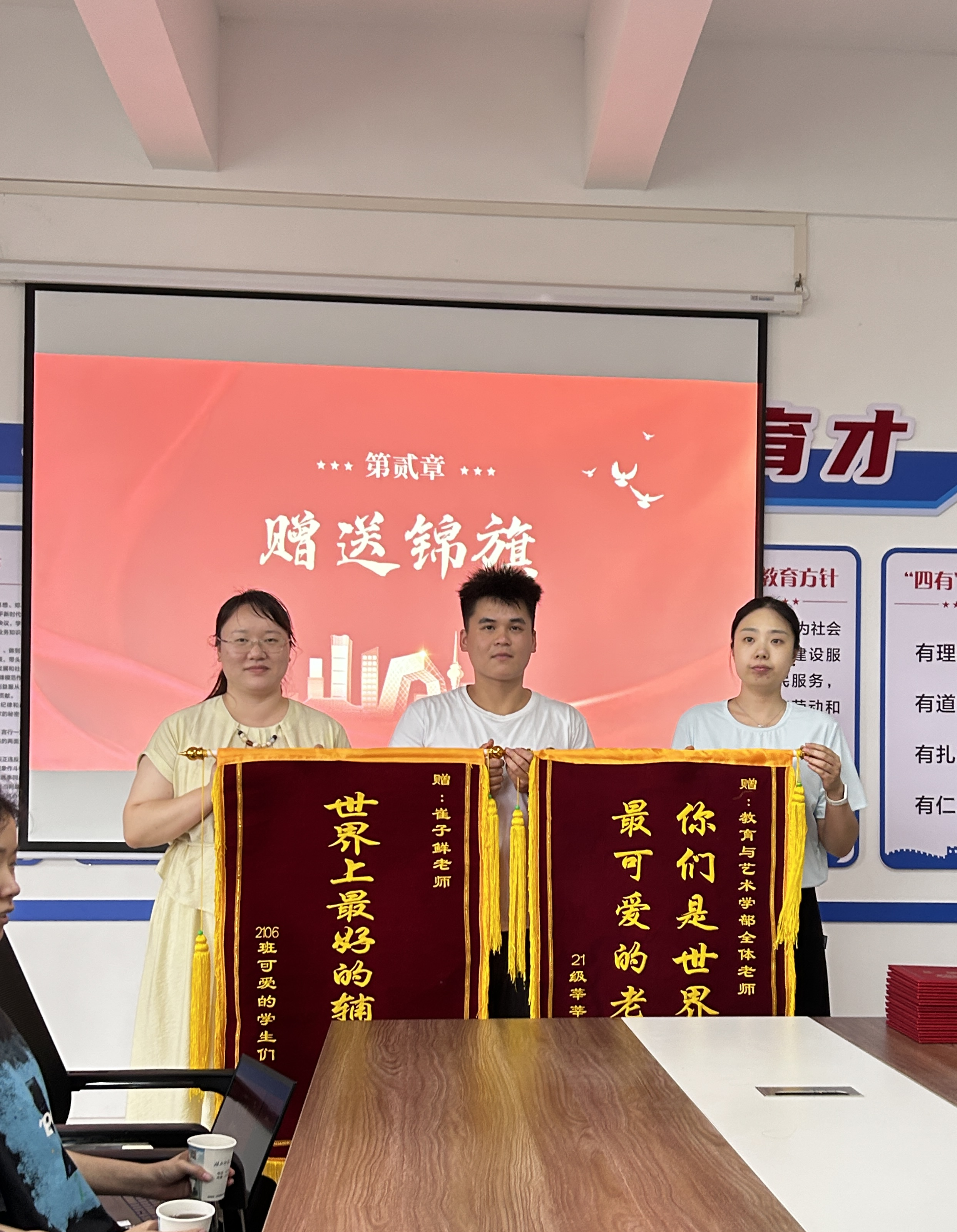 会中,为表达对老师的感恩,小教2106班代表向辅导员、专业老师敬赠锦旗;随后,与会领导老师们为毕业生代表颁发2025届毕业生校友会联络人任命聘书,构建长效联络机制,凝聚校友力量。陈书记在总结发言中感谢代表们的宝贵建议并强调:联络员将承担校友资源整合、行业信息互通、就业资源共享三重职责,成为学部发展的延伸触角。同时以饱含深情的“三处合影、三首歌、三句话”寄语毕业生,激励其在新征程中奋勇前行。