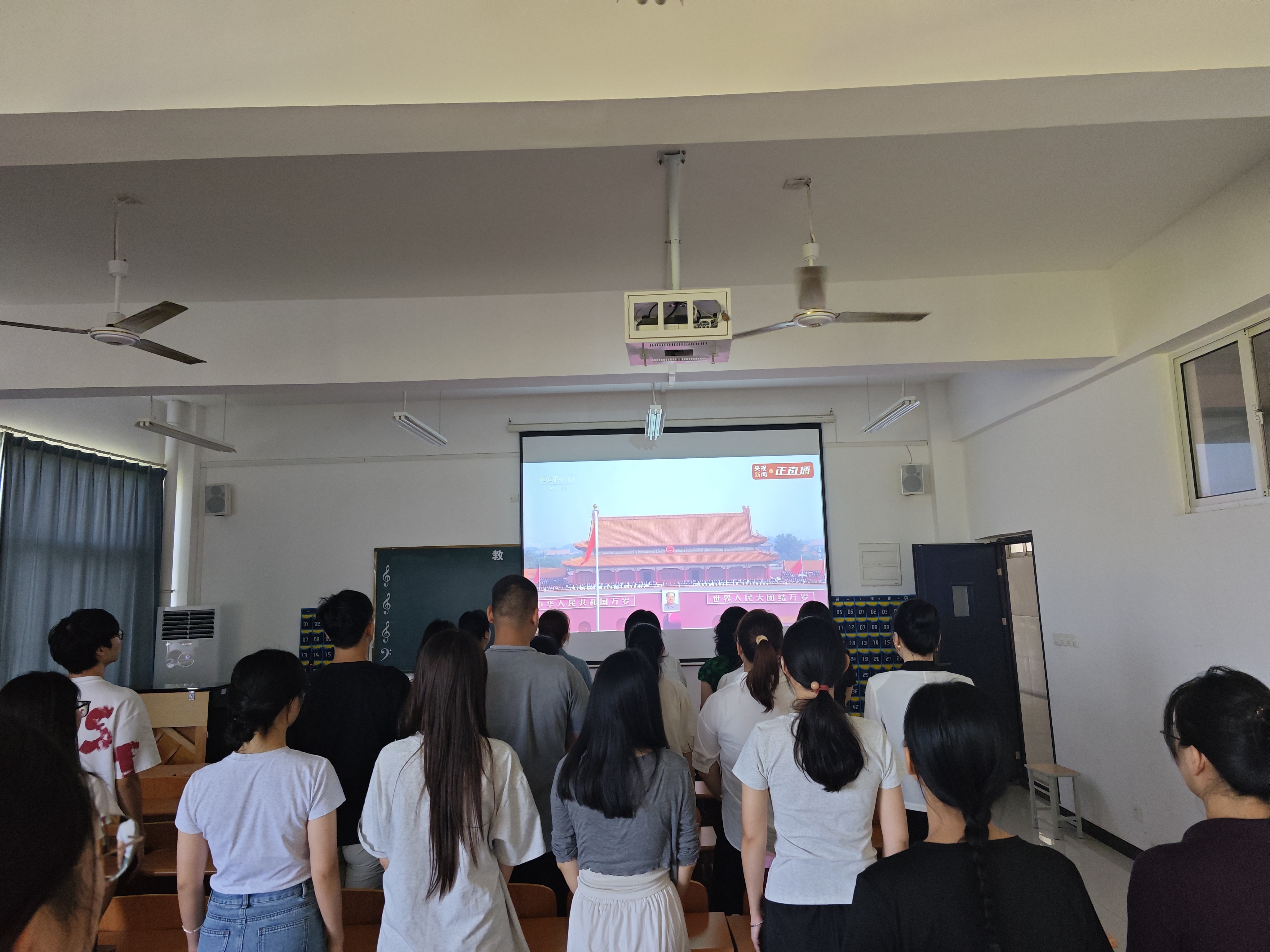 上午10时,当庄严的国歌奏响,五星红旗冉冉升起,观看直播的师生们全体起立,向国旗行注目礼,现场气氛庄严肃穆。在整个阅兵过程中,师生们被整齐威武的徒步方队、先进精良的装备方队以及翱翔天际的空中梯队所震撼。脸上刻满历史的抗战老战士方队经过时,许多师生眼眶湿润,他们为老战士们的奉献和牺牲精神深深感动,纷纷表示这是对历史的铭记,也是对英雄的崇高敬意。