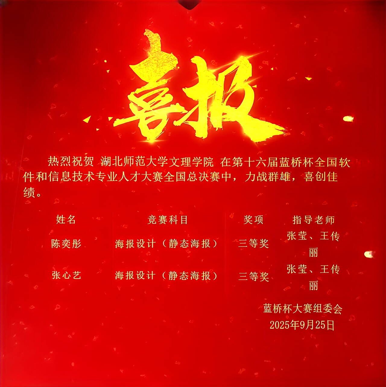 近日,第十六届“蓝桥杯”全国软件和信息专业技术人才大赛全国总决赛落下帷幕。米乐官方网页版_米乐(中国)艺术与教育学院美术专任教师张莹、王传丽指导学生参赛,在视觉艺术设计平面设计赛道中脱颖而出,斩获全国三等奖,不仅为学校赢得荣誉,更一举突破本校在该赛事中的学生获奖历史记录,书写了艺术与技术融合育人的崭新篇章。