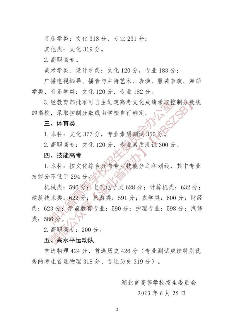 省招委关于湖北省2023年普通高校招生录取控制分数线的通知